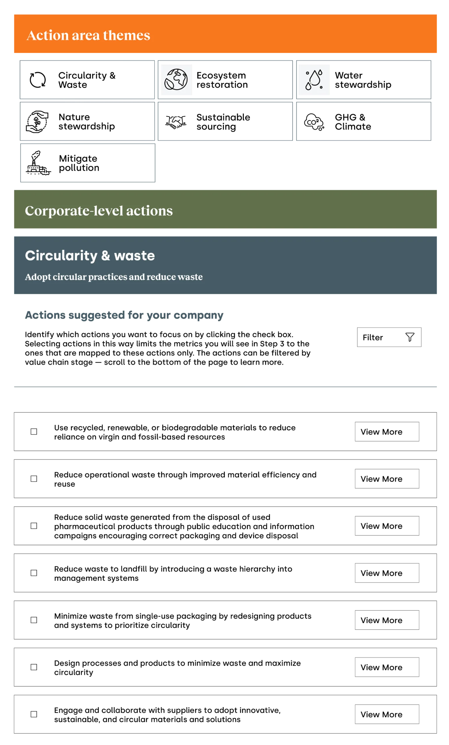 We’ve categorized the actions in the Portal under two elements: action areas by theme (e.g., circularity and waste) and corporate-level actions (e.g., reduce operational waste through improved material efficiency and reuse).