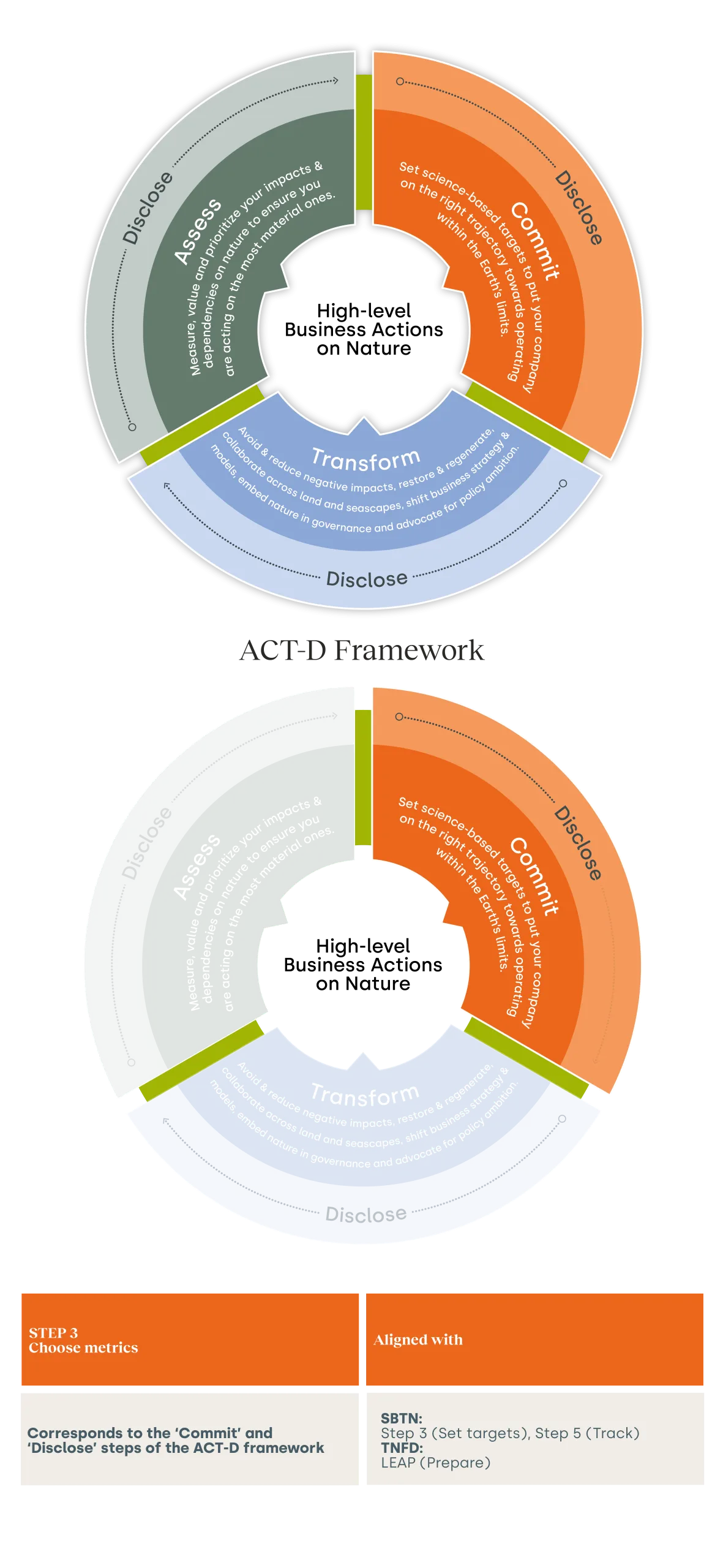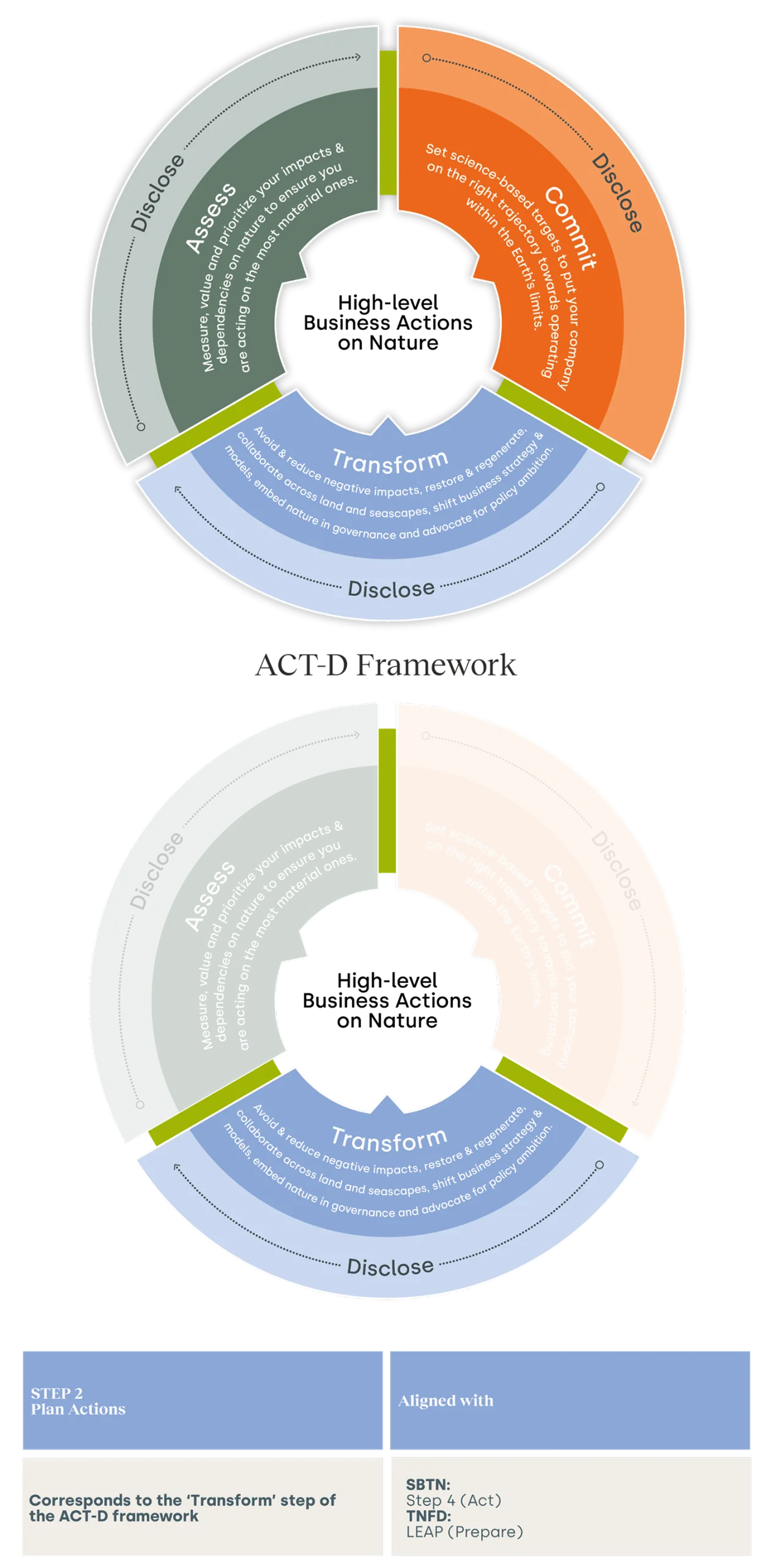 For each step, this document outlines the main elements of the methodology following the ACT-D framework and explains how it connects to the Science Based Targets Network (SBTN) and Taskforce on Nature-related Financial Disclosures (TNFD) guidance.