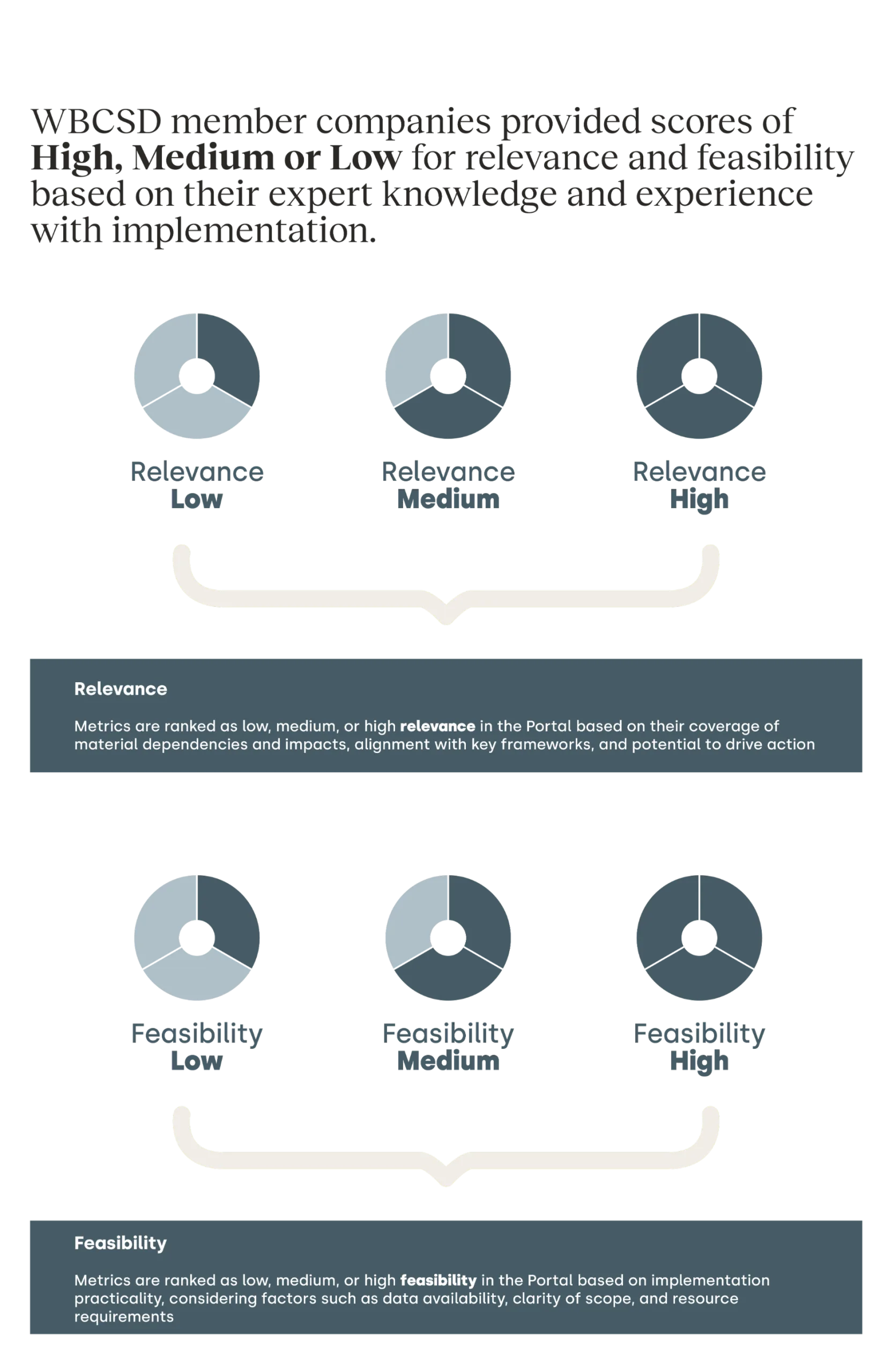 We have sourced the metrics featured in the Portal exclusively from existing frameworks identified by the working group as the most relevant. We have introduced no new metrics. The Portal currently features more than 550 metrics across all sectors. These represent a subset of the broader set of nature-related metrics initially identified as the metrics that scored ‘Low’ for relevance and feasibility. We have not included them in the Portal. The scores reflect the conditions at the time of the assessment and will evolve over time due to factors such as technology advances and data availability.