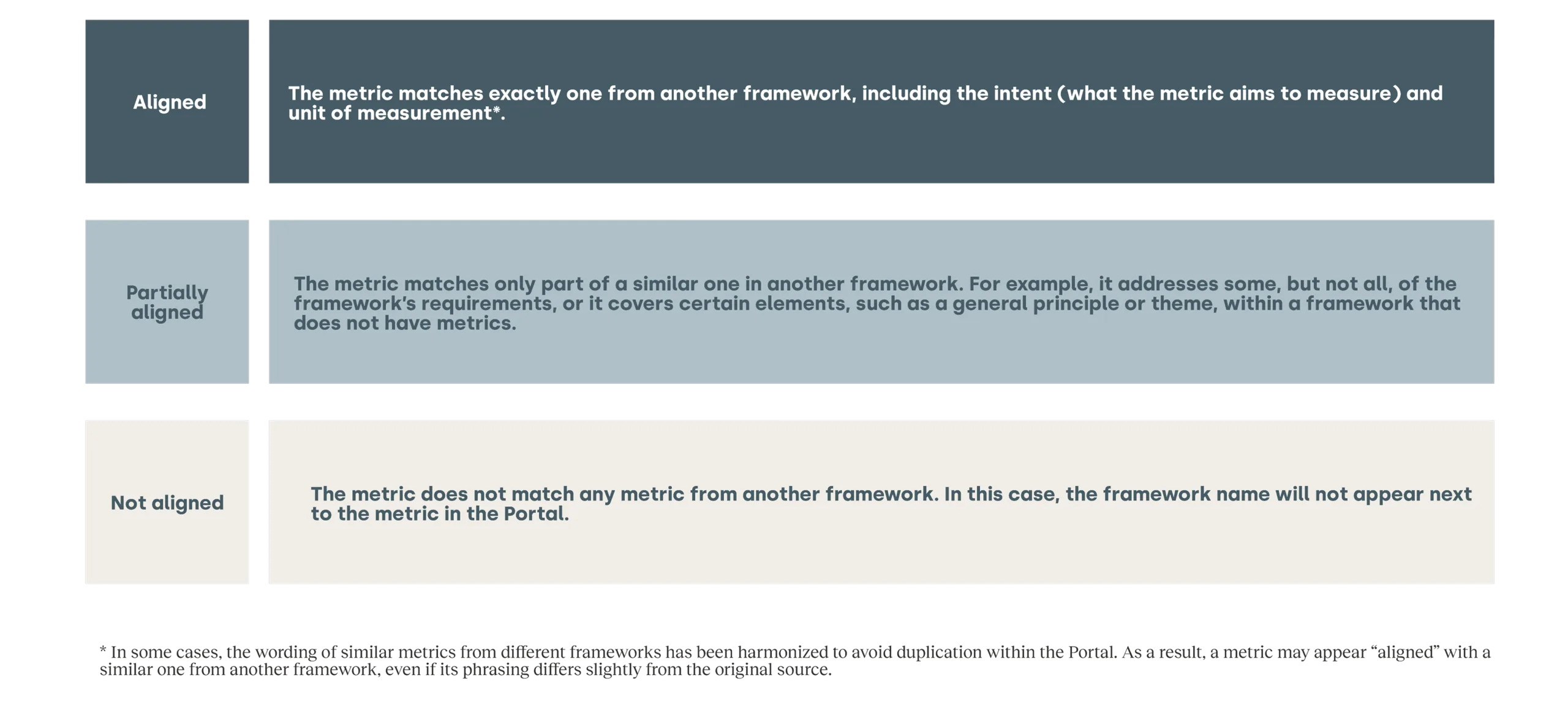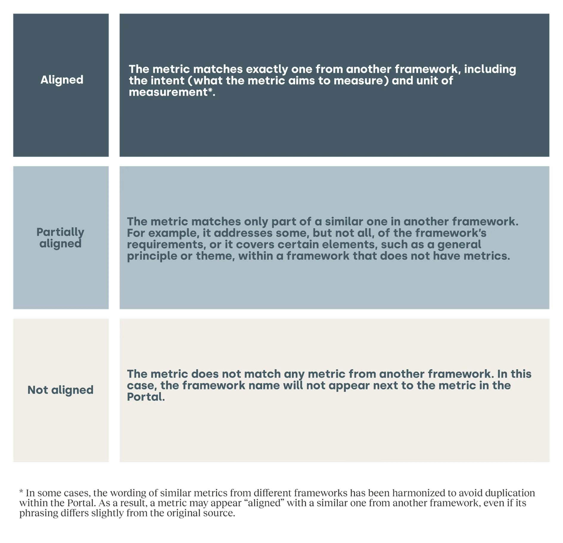 We reviewed the metrics in the Portal for alignment across the most relevant frameworks for the sector. If a metric matches a similar one in other frameworks, it is tagged as “Aligned”. If not, it is tagged as “Partially aligned” or “Not aligned” based on the criteria below.