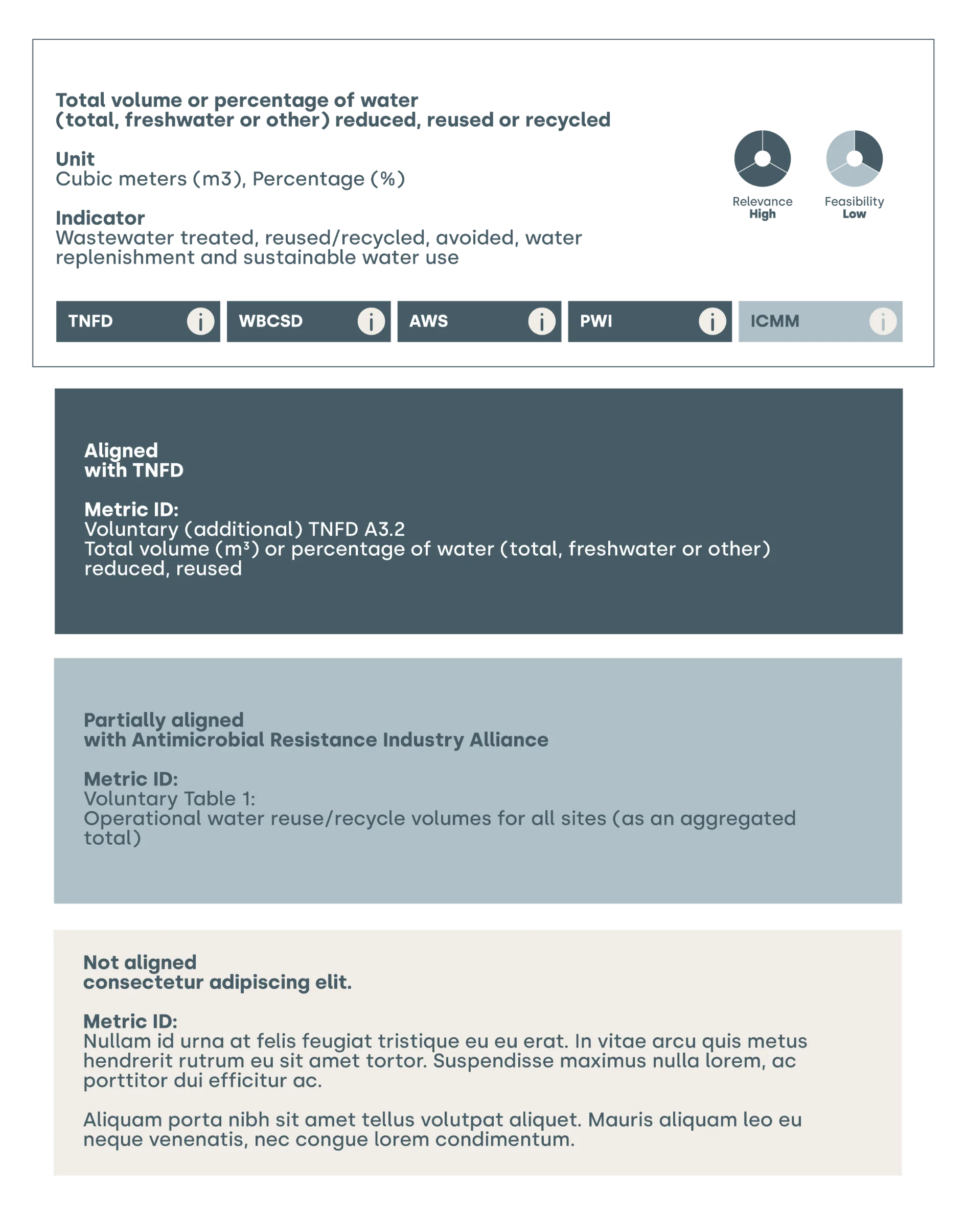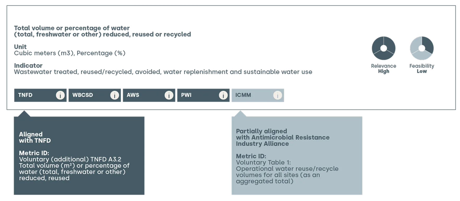 While some metrics apply across all sectors (such as water withdrawal and consumption from areas of water scarcity, area of degraded land restored) others are sector-specific (like soil organic material, amount of nuclear waste permanently and safely stored).