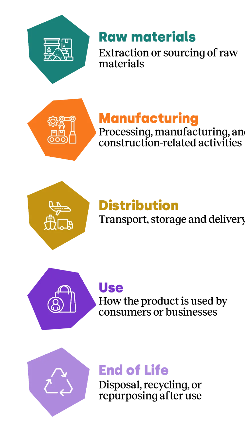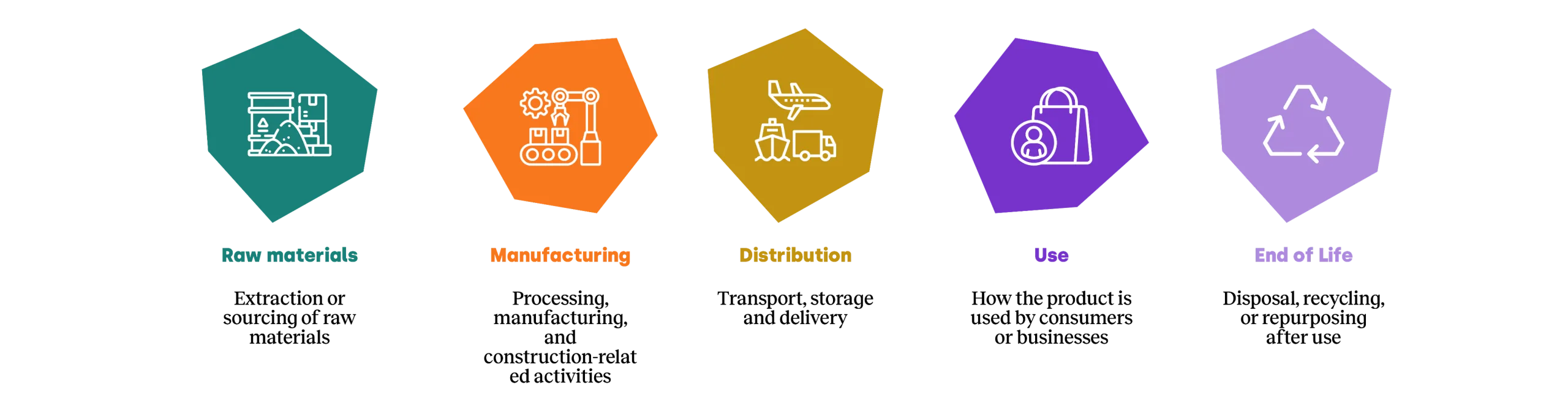 To ensure consistency across the sectors, we’ve aligned the stages of the value chains with the ISO 14044 standard (Environmental management — Life cycle assessment — Requirements and guidelines), which sets requirements for life cycle assessments. The diagram below defines the stages under the ISO 14044 standard.