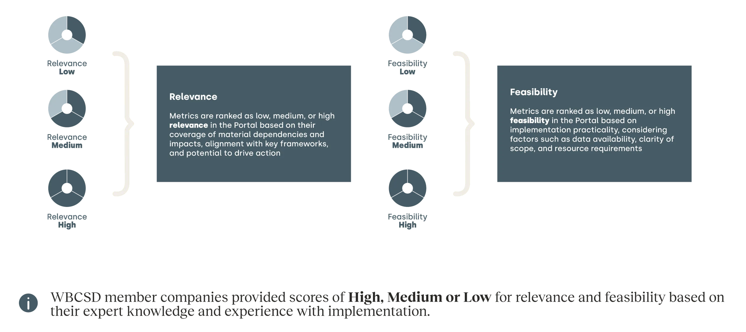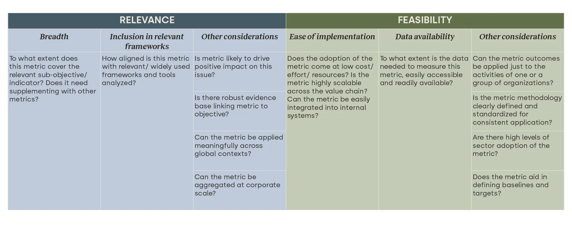 The relevance criteria reflect how well a metric considers material dependencies and impacts, aligns with key frameworks, and has the potential to drive action.