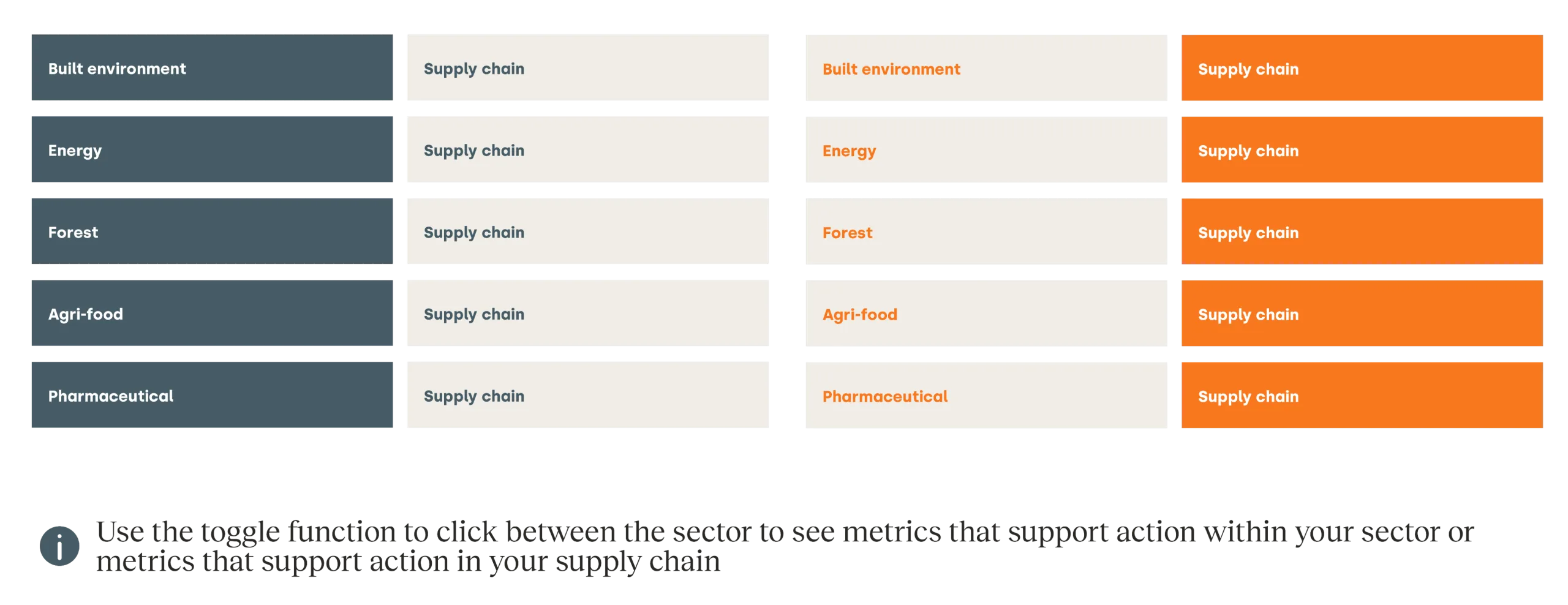 The procurement metrics draw from the relevant Frameworks. The working group then assessed the long list of metrics for relevance and feasibility for companies operating downstream and sourcing bio-based products from the forest sector and agri-food system.