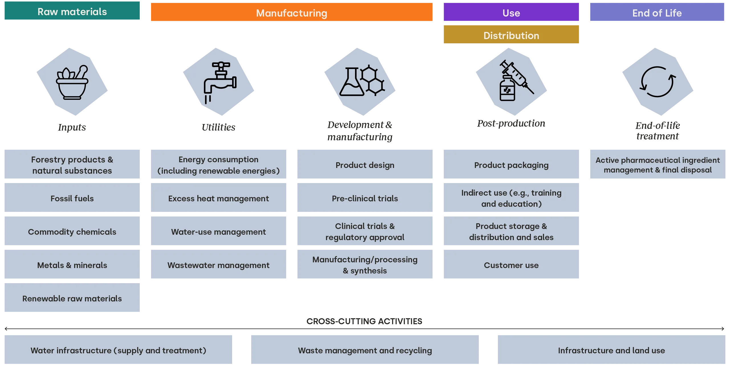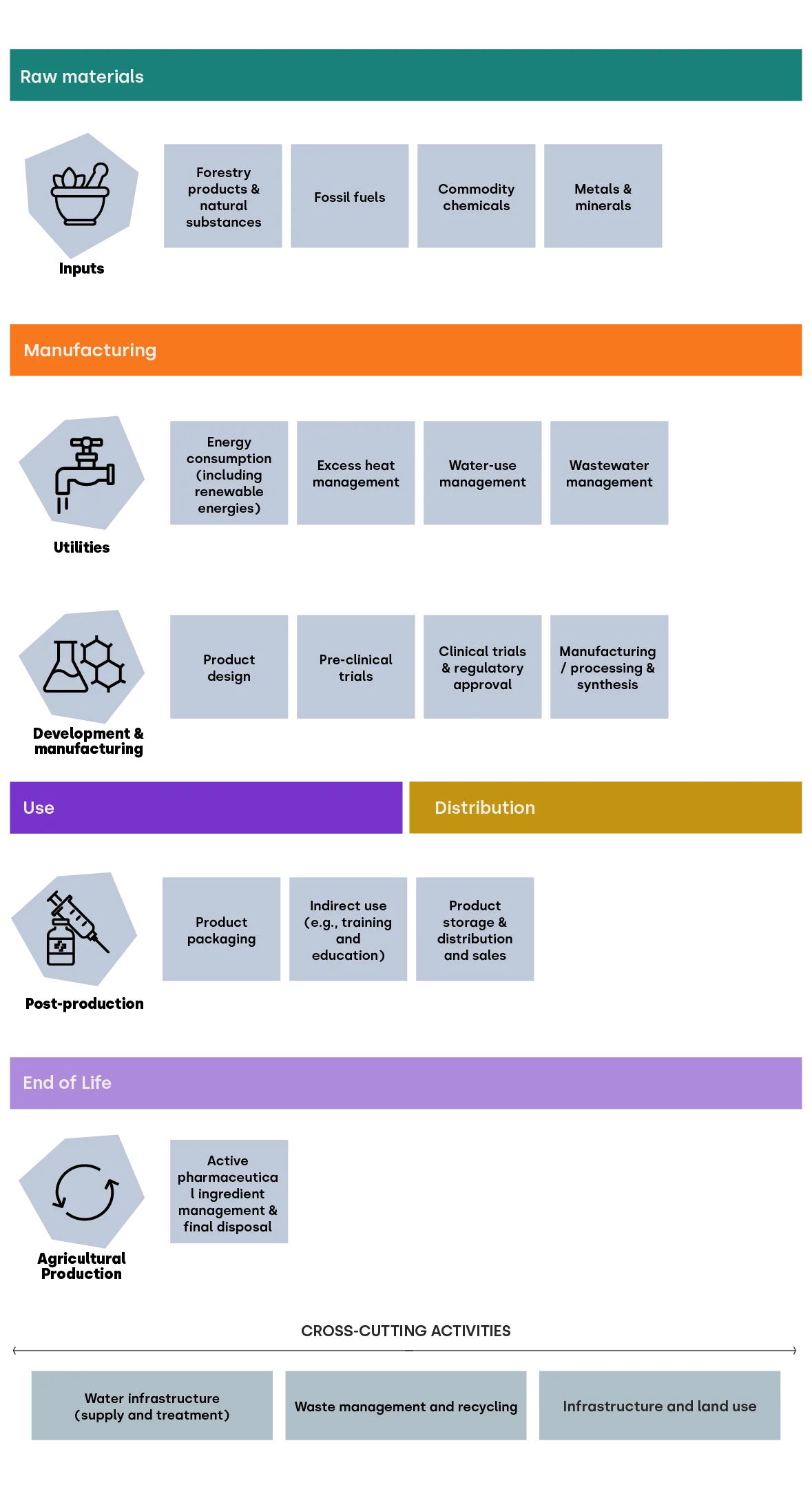 The diagram below illustrates the pharmaceutical value chain, highlighting its successive stages – from the sourcing of raw materials to the end-of-life of pharmaceutical products.