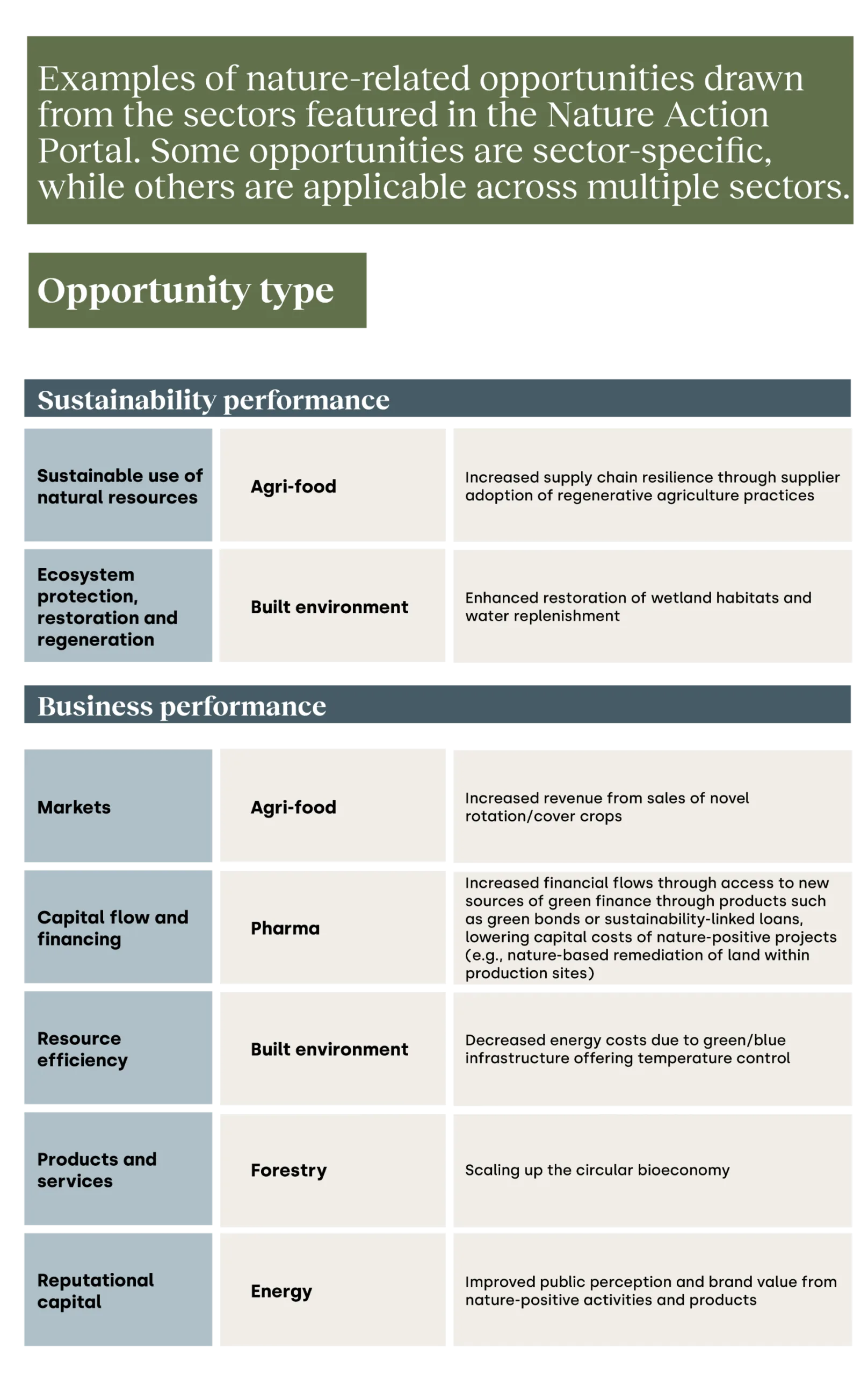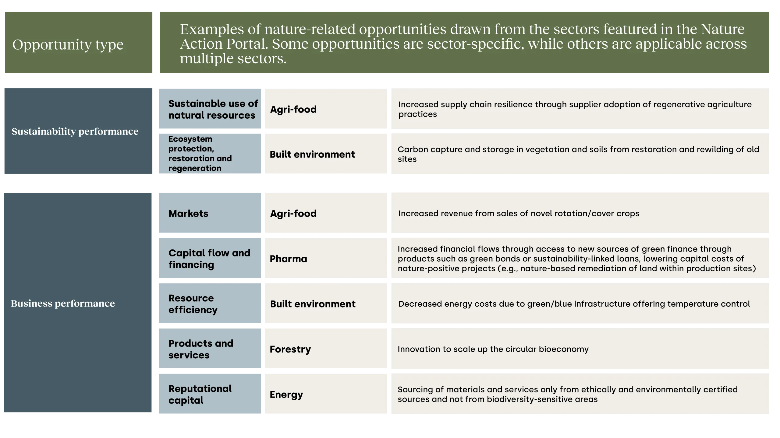 Nature-related opportunities (examples from the different sectors featured in the Nature Action Portal)