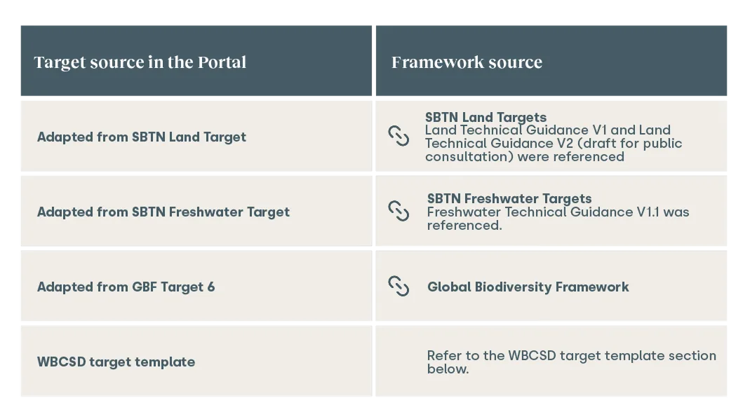 To support target-setting at different levels, the Portal links metrics to relevant targets from the Science Based Targets Network (SBTN) or the Global Biodiversity Framework (GBF). When this is not possible, the Portal provides an illustrative target example, without thresholds.