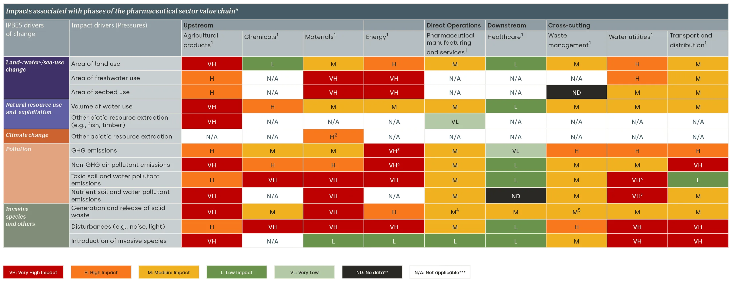 Working group members calibrated the results at the sector-level. The diagram below offers an overview of the potential impacts on nature that can occur along the pharmaceutical sector value chain.