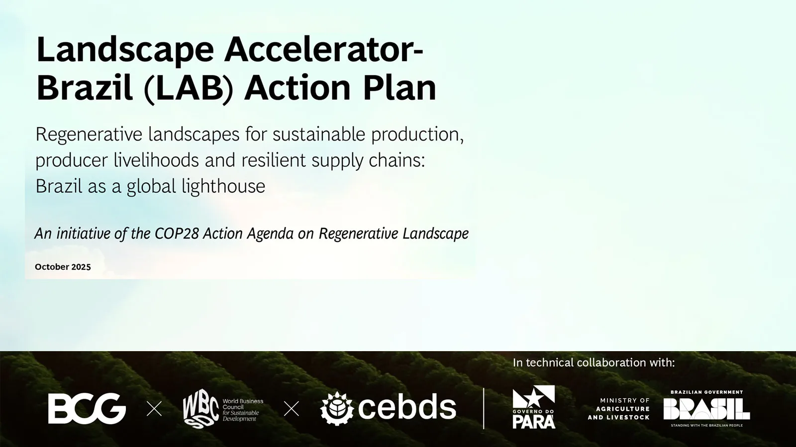 O LAB é uma iniciativa multissetorial liderada pelo setor privado no âmbito da Agenda de Ação da COP28 sobre Paisagens Regenerativas (AARL).O LAB une empresas do agronegócio, companhias de bens de consumo, instituições financeiras, ministérios do governo brasileiro e atores da sociedade civil em torno de uma missão comum: acelerar a transformação regenerativa de paisagens brasileiras estratégicas, promovendo resultados positivos para o clima e a natureza, benefícios econômicos para os produtores e maior resiliência das cadeias de suprimento.