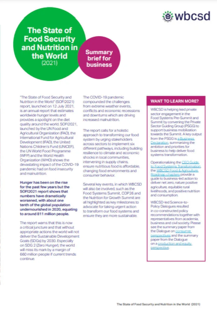 This business summary highlights the main points from the SOFI2021 report relevant to business and puts it in the context of global policy events and frameworks related to food systems transformation. The SOFI2021 report makes it clear that systemic changes are needed in the ways in which food is produced and consumed to reverse the trend of growing food insecurity and hunger and outlines six recommended pathways to address major drivers of food insecurity and malnutrition and to support a more sustainable food system.